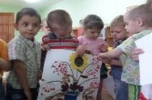 Воспитанники младшей группы (3-4 года) с коллективной работой "Осенняя рябина" , воспитатель Кошкина Мария Валерьевна.