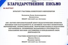 Наш педагог Баскакова Елена Александровна получила Благодарственное письмо за подготовку участника младшей группы Жуковой Инессы.