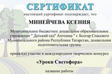Наша воспитанница Минейчева Ксения получила сертификат участника за участие во Всероссийском конкурсе "Уроки светофора". Педагог Петрова Валентина Владимировна.