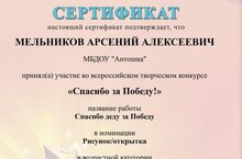 Наш воспитанник Мельников Арсений получил сертификат участника Всероссийского конкурса. Педагог Баскакова Елена Александровна.