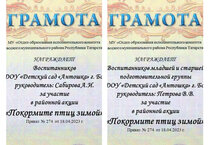 Наши педагоги Петрова Валентина Владимировна и Сабирова Алсу Исмагилловна получили грамоты за участие в районной акции "Покормите птиц зимой".