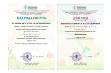 Наш педагог Петрова Валентина Владимировна и её воспитанник Николаев Тимофей получили дипломы. Тимофей диплом за 1 место, Валентина Владимировна Благодарность педагогу за подготовку.