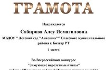 Наш педагог Сабирова Алсу Исмагилловна получила грамоту за 1 место во Всероссийском конкурсе "Зимующие перелётные птицы".