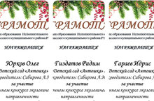 Наши дети приняли также участие в районном конкурсе экологической направленности "Альтернативная новогодняя ель" и также были награждены грамотами за участие Рубцова Самина, Артюшин Егор, Башкиров Матвей, а Гранёнкова Валентина заняла третье почётное место.Педагог Петрова Валентина Владимировна.