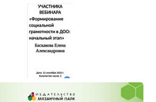 Наш педагог Баскакова Елена Александровна получила сертификат участника вебинара " Формирование социальной грамотности в ДОО начальный этап".