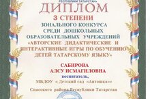 Наш педагог Сабирова Алсу Исмагиловна получила диплом 3 степени зонального конкурса среди дошкольных образовательных учреждений "Авторские дидактические и интерактивные игры по обучению детей татарскому языку" 15.04.2022