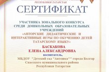 Наш педагог Баскакова Елена Александровна получила сертификат участника зонального конкурса среди дошкольных образовательных учреждений "Авторские дидактические и интерактивные игры по обучению детей татарскому языку" 15.04.2022