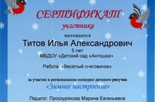 Наш воспитанник Титов Илья получил сертификат участника за участие в региональном конкурсе детских рисунков " Зимнее новогоднее настроение". Педагог Проскурякова Марина Евгеньевна