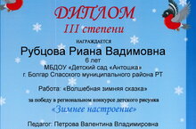 Наша воспитанница Рубцова Риана приняла участие в региональном конкурсе детских рисунков " Зимнее новогоднее настроение" и получила диплом победителя III степени. Педагог Петрова Валентина Владимировна.
