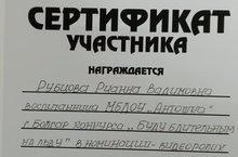 Наша воспитанница Рубцова Риана также приняла участие в конкурсе " Буду бдительным на льду и на воде " в номинации " видеоролик" и также получила сертификат участника.Педагог Петрова Валентина Владимировна.
