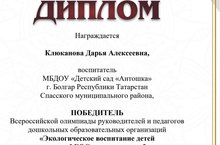 Наш педагог Клюканова Дарья Алексеевна приняла участие во Всероссийской олимпиаде по экологическому воспитанию детей дошкольного образования и получила диплом победителя!!!