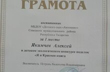 Наш воспитанник Якимчев Алексей занял первое место в конкурсе поделок " Я и Красная книга". Педагог Петрова Валентина Владимировна.
