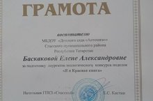 Наш педагог Баскакова Елена Александровна награждена грамотой за подготовку участников в конкурсе поделок " Я и Красная книга" " Спасский " Заказник" Мурзак Л.А.