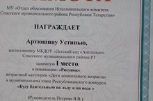 Наша воспитанница старшей группы Артюшина Юстиния приняла участие в конкурсе номинация рисунок "Буду бдительным на льду и на воде" и заняла 1 место!!!! Педагог Петрова Валентина Владимировна. Поздравляем!!! Так держать!!!