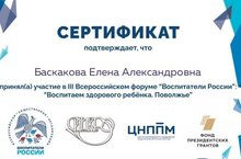 Наш педагог Баскакова Елена Александровна приняла участие в III Всероссийском форуме " Воспитатели России" : "Воспитаем здорового ребёнка. Поволжье" и была награждена сертификатом участника.
