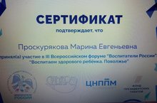 Наш педагог Проскурякова Марина Евгеньевна приняла участие в III Всероссийском форуме " Воспитатели России ": " Воспитаем здорого ребёнка. Поволжье" и была награждена сертификатом участника.