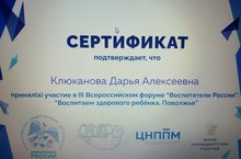 Наш педагог Клюканова Дарья Алексеевна приняла участие в III Всероссийском форуме " Воспитатели России ": " Воспитаем здорого ребёнка. Поволжье" и была награждена сертификатом участника.