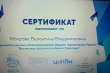 Наш педагог Мокрова Валентина Владимировна приняла участие в III Всероссийском форуме " Воспитатели России ": " Воспитаем здорого ребёнка. Поволжье" и была награждена сертификатом участника.