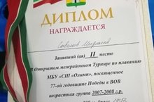 "Спорт - это здорово!", считает Савельев Мирослав, который в Открытом межрайонном турнире по плаванью, посвящённом 77 годовщине Победы в Великой Отечественной войне, занял почётное 2 место. Молодец, Мирослав! -