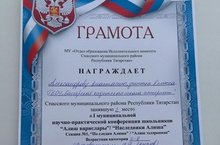 10.03.21 проводилась первая муниципальная научно-практическая конференция школьников «Наследники Алиша».Была награждена Александрова Анастасия занявшая 2 место,возрастная категория 6-8 классы.