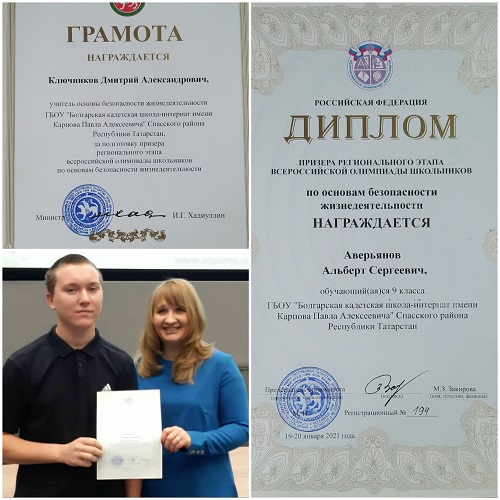 Опубликовано: 23.01.2021С 20.01 по 23.01. 2021г. на базе Поволжской академии спорта и туризма г.Казань состоялся республиканский этап всероссийской олимпиады школьников по ОБЖ. Призером стал учащийся 9 класса Аверьянов Альберт (учитель Ключников Д.А.)