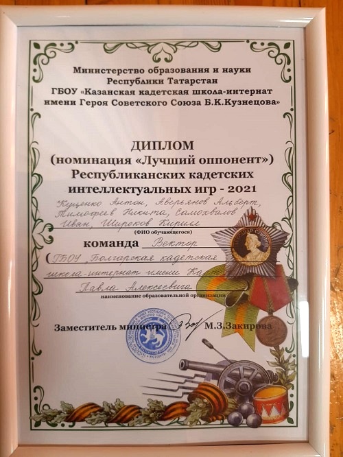 Успешно справившись с конкурсами Республиканских интеллектуальных игр, и по итогам команда Болгарской кадетской школы-интернат получила диплом в номинации " Лучший оппонент ". Всего в играх приняли участие 15 команд детских школ и школ-интернатов РТ.