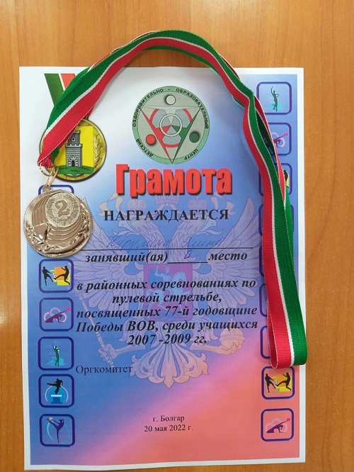 Опубликовано: 21.05.2022Спорт играет важную роль в жизни кадет. На этот раз в центре внимания была меткость. Наши кадеты - Прохоров Егор, Киямов Рустам и Нуруллина Элина - участвовали в районных соревнованиях по пулевой стрельбе, посвященные 77-й годовщине Победы в Великой Отечественной войне, и Нуруллина Элина (8кл), заняла почётное 2 место.