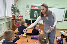 Чуксина О.Н., учитель ОБЖ, провела беседу с учащимися 1 классов, раздала световозвращаюшие брелки и объявила о конкурсе карточек (безопасного маршрута движения) Дом-Школа-Дом.