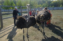 Страусов мы кормили и фотографировались с ними. А хозяйка фермы Татьяна показала, как правильно расположить к себе страуса. Они очень любят ласку, поэтому сами ищут встречи с людьми и ходят за ними по пятам. На ферме страусы ведут себя практически так же, как в дикой природе - гоняются друг за другом, кокетливо делают реверансы, причудливо распускают крылья и несут яйца. Нам рассказали, как живут страусы, чем они питаются. Также на ферме есть куры, шиншилы, и прочая птица, кролики, овцы, бараны, лошади с жеребятами. Даже можно покататься верхом на лошади.