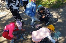 День завершился разработкой уголков отрядов и конкурсом рисунков на асфальте.