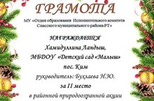 Наш педагог Бухлаева Надежда Юрьевна и ее воспитанница Хамидуллина Ландыш приняли участие в конкурсе поделок "Альтернативная новогодняя ель" и получили благодарственное письмо.