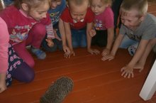К детям пришел в гости "Колючий ежик". Воспитатель Бухлаева Н.Ю. рассказала детям об этом безобидном животном, сказала следует обратить внимание на колючий клубок иголок. Дети подражают: фыркают, как ежик, спрашивают чем он питается. Детям было очень интересно наблюдать за ним.