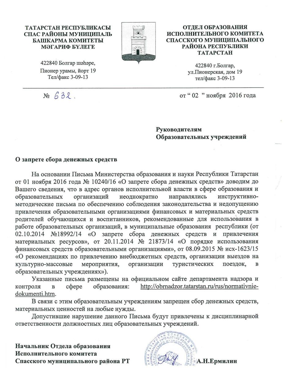 Письмо № 632 от 02 ноября 2016г."О запрете сбора денежных средств"