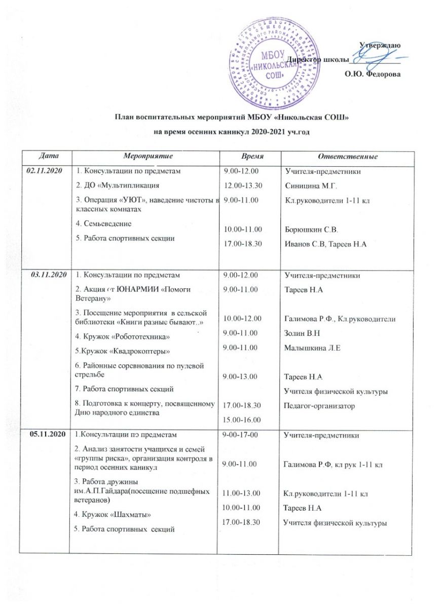 С 2 по 8 ноября школьники вышли на осенние каникулы. Для работы на каникулах составлен план мероприятий