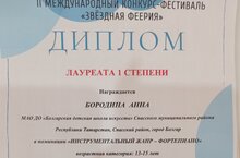 В марте месяце ученица музыкального отделения по классу фортепиано Бородина Анна участвовала во II Международном конкурсе - фестивале "Звездная феерия" в номинации "Инструментальный жанр-фортепиано" и получила диплом Лауреата - I степени (класс преподавателя Илюхиной И.П.)
