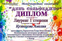 Ученица музыкального отделения Кузнецова Амелия участвовала в Международном олимпиаде "День сольфеджио" и получила диплом Лауреата I степени (преп. Парамончева Е.В.).