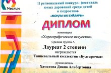 В конце марта учащиеся хореографического отделения ТК "Булгарочка" участвовали во II Региональном конкурсе - фестивале юных дарований среди детей и подростков "МОҢЛЫ ЫК БУЙЛАРЫ", номинация "Хореографическое искусство". Поздравляем коллектив с дипломом Лауреата II степени, желаем им дальнейших, творческих успехов. (класс преподавателя Хаматовой Дианы Альбертовны)