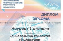 С 5 по 7 апреля танцевальный коллектив "Булгарочка" участвовал в Международном многожанровом заочном конкурсе "Восхождение творческих звезд", номинация "Хореография", возрастная группа 10-14 лет, номер "Спасские лебеди" - Лауреат I степени (преп. Хаматова Д.А.). Поздравляем их и желаем творческих успехов.