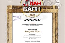 В апреле месяце ученик музыкального отделения по классу баяна Битунов Илья участвовал в Международном конкурсе молодых исполнителей на баяне, гармошке и аккордеоне, номинация "Исполнительство на баяне", возрастная категория 10 лет. Поздравляем его с победой с Дипломом I степени.