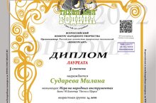 В январе месяце ученица по классу баяна Сударева Милана (преподаватель Артюшина Л.А.) участвовала во Всероссийском конкурсе народного творчества "Тихая моя родина" и получила диплом лауреата III степени.
