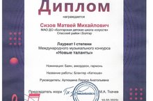 В марте месяце ученик музыкального отделения по классу баяна Сизов Матвей участвовал в Международном музыкальном конкурсе "Новые таланты" в номинации "Баян, аккордион, гармонь" и получил диплом Лауреата - I степени (класс преподавателя Артюшиной Л.А.)