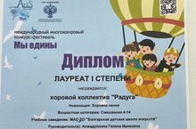 В начале декабря хоровой коллектив БДШИ «Радуга» под руководством Ахмадуллиной Г. И. принял участие в заочном Международном конкурсе – фестивале «Мы едины» (г. Москва). Конкурс проходил при поддержке Министерства культуры РФ. Цель конкурса: сохранение и развитие национальных культур, выявление талантливых конкурсантов, повышение профессионального уровня отдельных исполнителей и творческих коллективов.