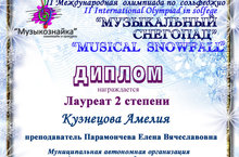В декабре м-це, ученица музыкального отделения по классу фортепиано Кузнецова Амелия (3 кл.) участвовала во II Международном олимпиаде по сольфеджио "Музыкальный снегопад" и награждена дипломом лауреата II степени.
