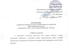 16 февраля 2021г. в МАО ДО "Болгарская детская школа искусств" объявлен районный конкурс детского художественного творчества "Моя прекрасная земля", посвященного 240-летию города Куйбышева-Болгар./upload/storage/org6120/files/Положение о районном конкурсе детского художественного творчества.docx