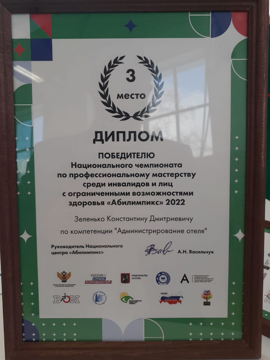 Опубликовано: 05.12.20222 декабря в международном центре компетенций г.Казань состоялось награждение победителей и призёров национального чемпионата по профессиональному мастерству среди инвалидов и лиц с ограниченными возможностями здоровья "Абилимпикс"- 2022. Команда из Татарстана заняла 2 место.Наши ребята Скрипаль Егор и Зеленко Константин стали бронзовым призерами по компетенции "Администрирование отеля" им заслуженно были вручены медали ,дипломы, и сертификаты. Со словами приветствия к присутствующим обратились и.о. министра образования Поминов А.И. и министр молодёжи РТ Сулейманов Т.Д. , потом состоялась прямая линия сборной команды с президентом Российской Федерации Путиным В.В