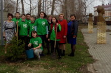 Добровольцы и педагоги Дома детского творчества на центральной площади города, у аллее героев посадили ели.