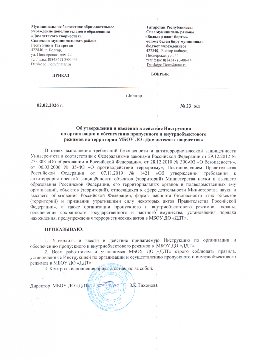 Инструкция по организации и обеспечению пропускного и внутреннего режимов
