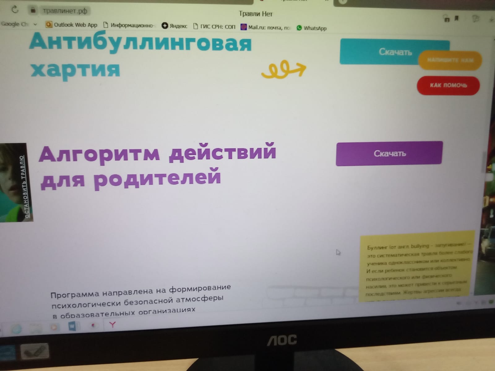 В образовательных организациях нашего района проводится профилактическая работа против травли (буллинга) учащихся. Представляем на фото кадры такой работы. Предлагаем Вам инфографику и координаты сайта с антибуллинговой программой для школ и рекомендациями (алгоритмом действий) для родителей в случае возникновения школьной травли.