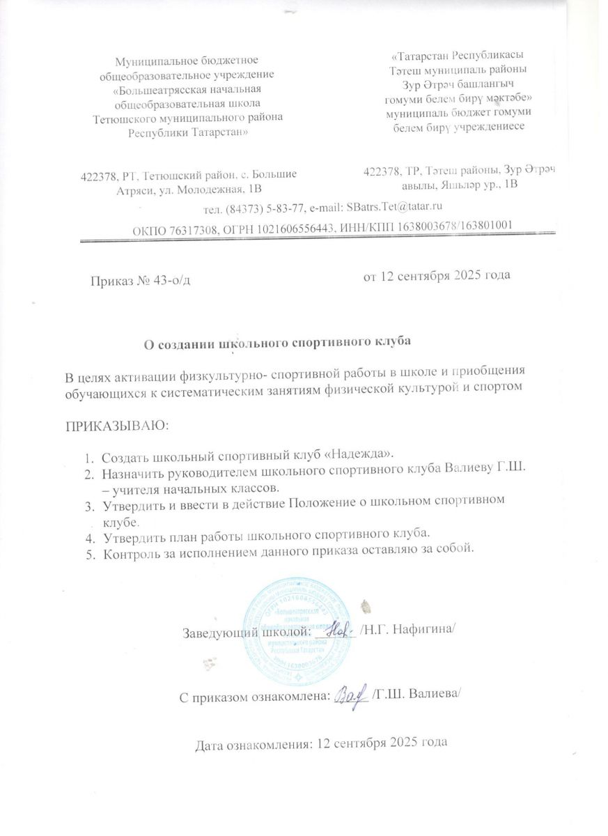 Муниципальное бюджетное общеобразовательное учреждение «Большеатрясская начальная общеобразовательная школа» Тетюшского муниципального района Республики Татарстан/Татарстан Республикасы Тәтеш муниципаль районы «Зур Әтрәч башлангыч гомуми белем бирү мәктәбе» муниципаль бюджет гомуми белем бирү учреждениесе