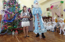 С ёлкой, песней, хороводом!С новыми игрушками,С бусами, хлопушками!Всех гостей мы поздравляем,Всем детишкам мы желаемСветлой жизни сто годовИ здоровья сто пудов! -